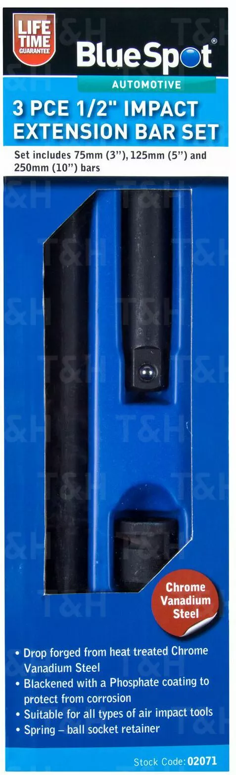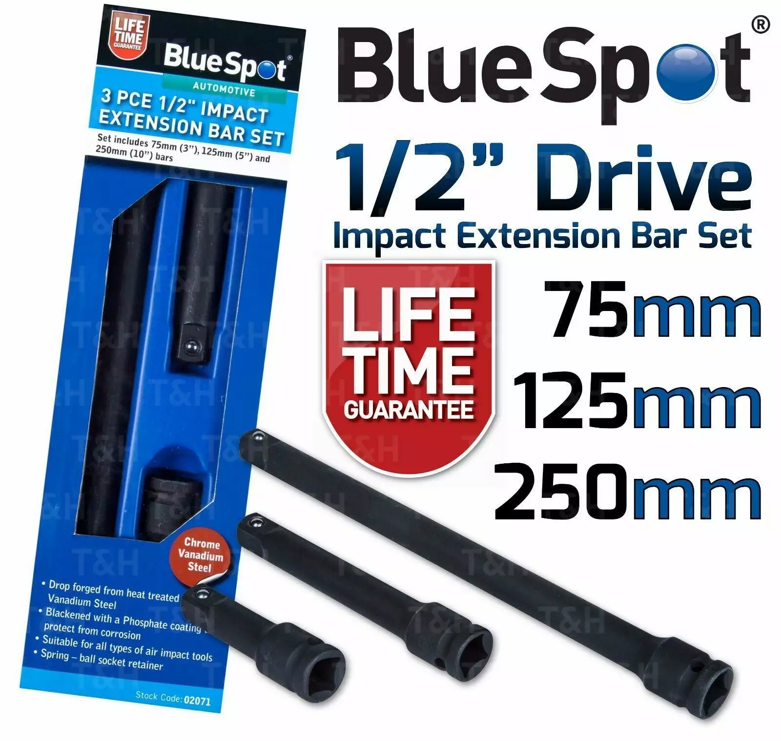 Be the first to review “BLUESPOT 1/2″ Drive IMPACT Extension Bar Set 75mm – 250mm” Cancel reply
