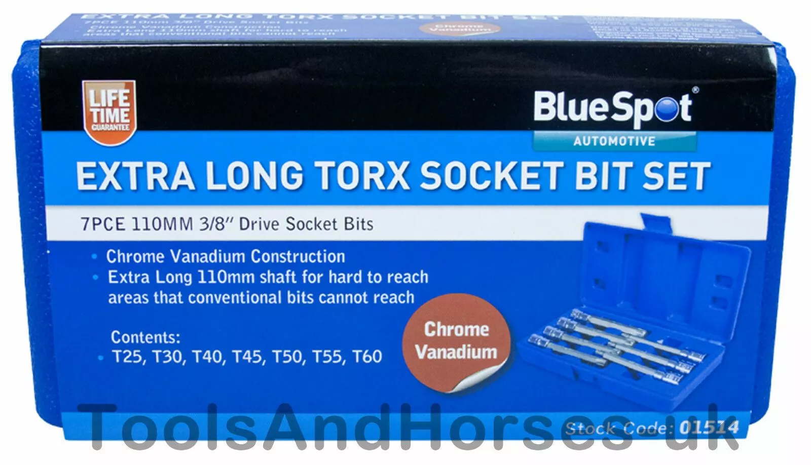 Be the first to review “BlueSpot 7pc Extra Long Torx Bit Star Socket Set 3/8″ Dr T25 T30 T40 T45 T50 T55 T60 TORX” Cancel reply