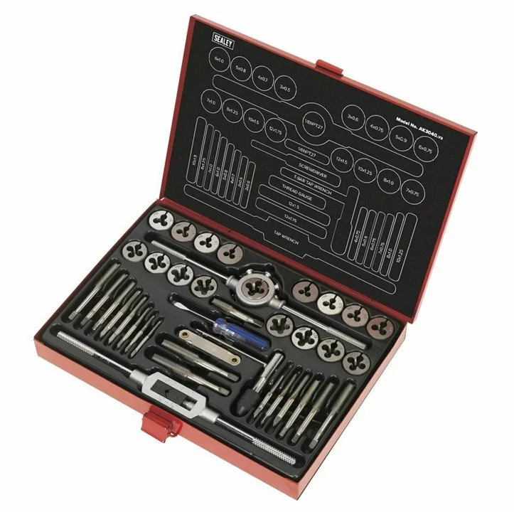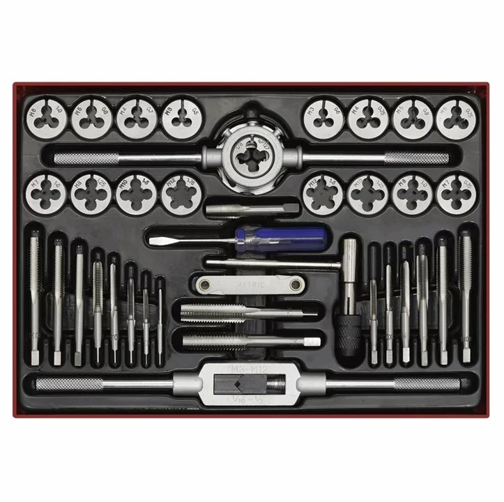 - Set also includes T-handled tap wrench and Metric screw pitch gauge.