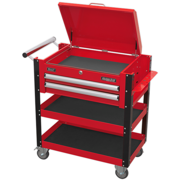 - Garage or workshop trolley with two shelves and a lockable gas sprung supported lid, which allows for items to be kept safe when not in use.