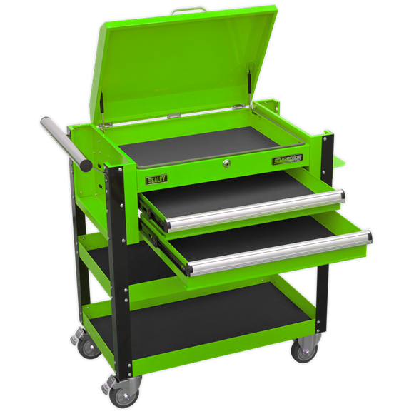 - Garage or workshop trolley with two shelves and a lockable gas sprung supported lid, which allows for items to be kept safe when not in use.