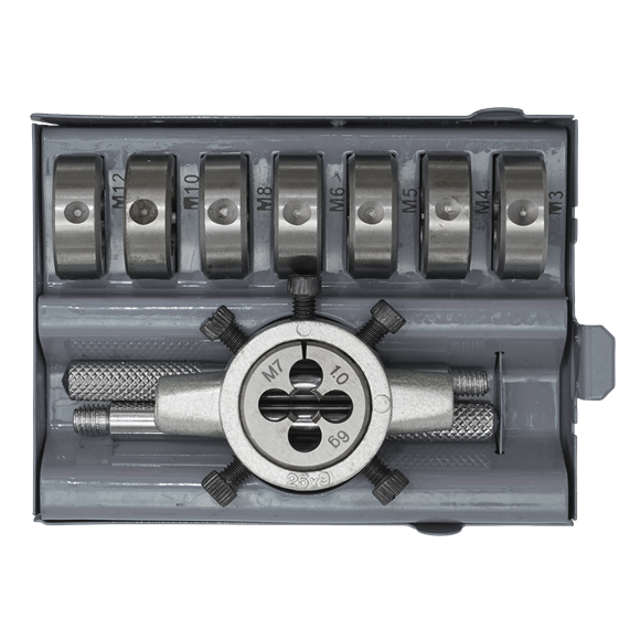 - Contents:Â Dies; 3 x 0.5, 4 x 0.7, 5 x 0.8, 6 x 1, 8 x 1.25, 10 x 1.5, 12 x 1.75mm,
