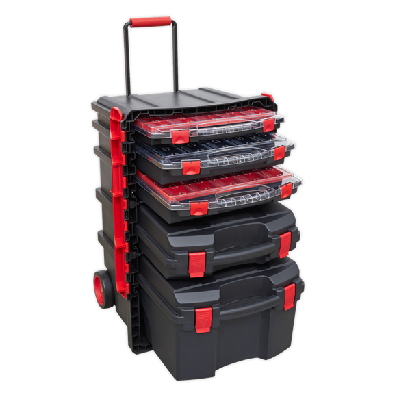 - Fully mobile with two heavy-duty wheels and a retractable handle.