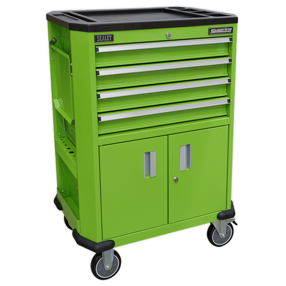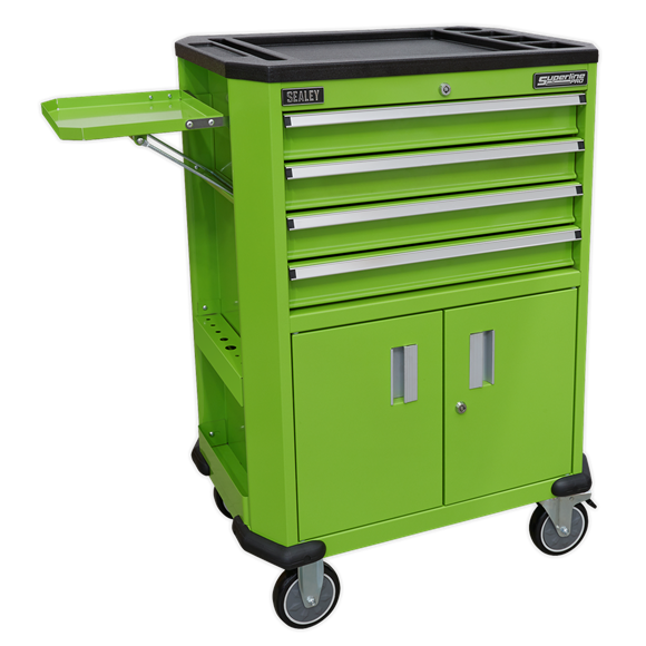 - Top of the trolley is covered in tough composite with built-in storage for small parts.