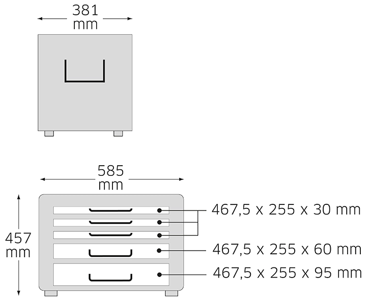 - 5 easily removed lockable drawers with transparent covers, with end-stops for the extendable rails, 3 different drawer heights.