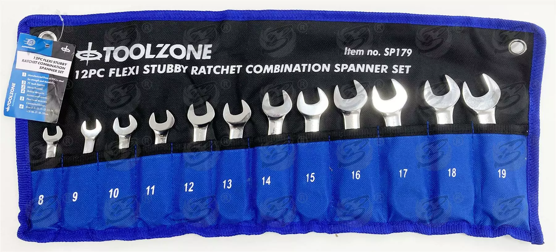 Toolzone Flexi Head Stubby Ratchet Spanner Set 8-19mm Flexible Ratchet Combination Wrench