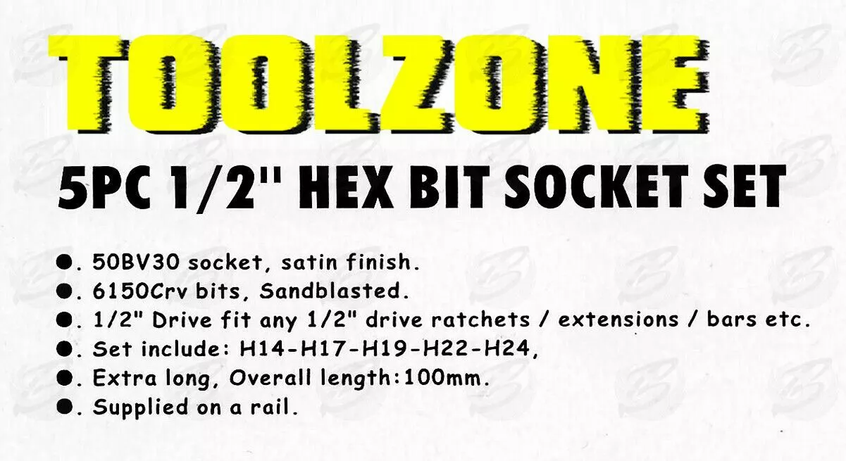 Be the first to review “Toolzone HEX Bit Sockets Extra Large & Long Hex Allen Key Socket Set H14 H17 H19 H22 H24” Cancel reply