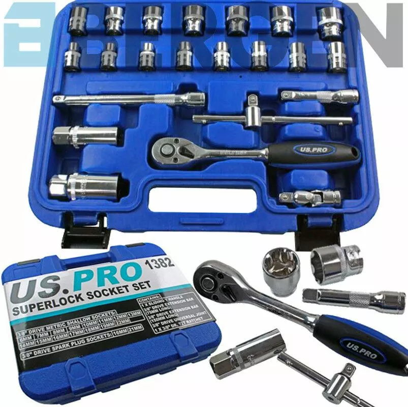 US PRO By BERGEN US PRO Super Lock 3/8″ Socket Set Shallow 22pc 6mm-22mm Metric Sockets & Ratchet