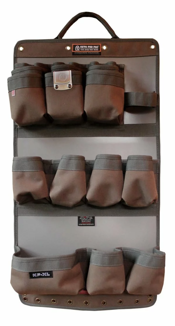 The KP-XL is a vertical pocket panel for tool storage made to accommodate tools and accessories that secures to truck doors, cages or shop walls.