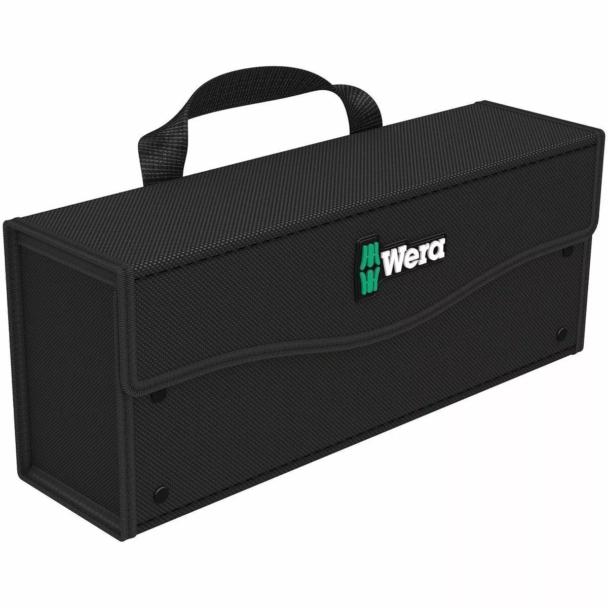 Wera’s 2go 3 Tool Box is made from a robust material which is permanently dimensionally stable thanks to its fabric lined plastic panel construction that also has a high resistance against cuts and stabs. A lid with flap provides further protection of your tools against damage and moisture, while the top handle allows the box to be easily carried on its own.