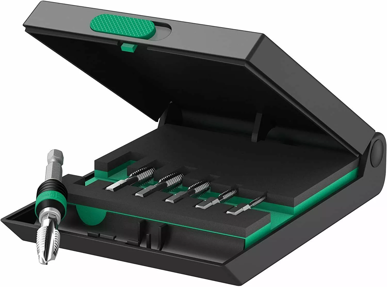 - Professional 7 piece tapping drill bit set in a padded stable plastic storage box