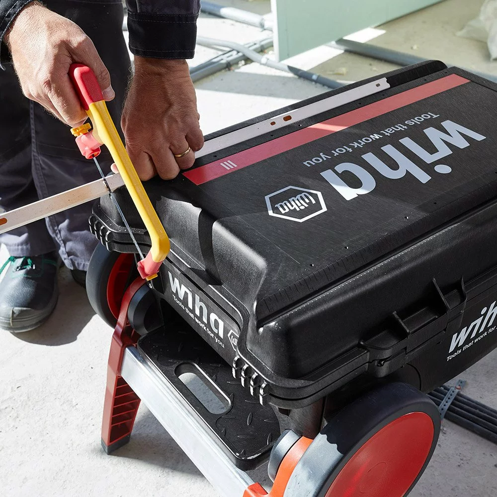 The case serves as a mobile workbench and simplifies working. The guide rails (V-groove) with scales (metric and imperial) in the case lid make it easier to cut materials such as cable pipes and ducts to size.
