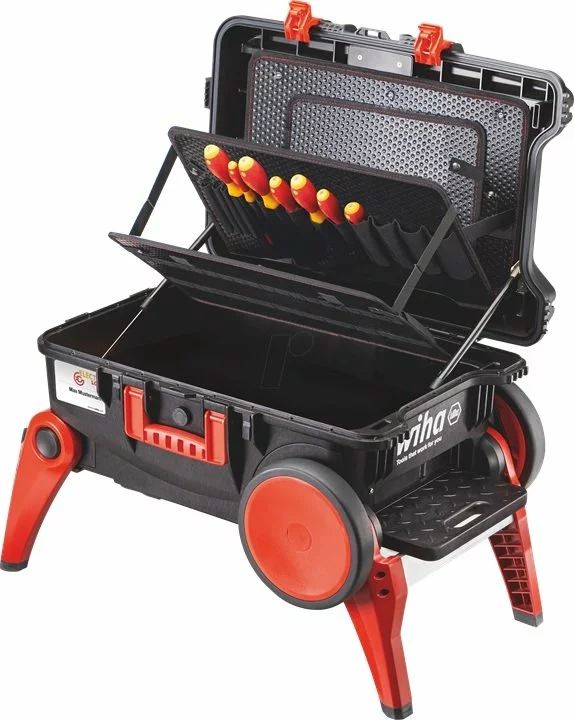 Thanks to the extra large wheels, it is easy to pull the case behind you on rough terrain or over stairs. Thanks to the fold-out legs, the case also serves as a non-slip step. In addition, the elevated position makes it comfortable to take out the tools, which is easy on the back.